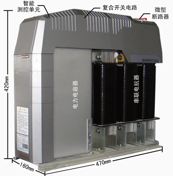 低压滤波式智能电容器主要由线路保护单元、智能测控单元、晶闸管复合开关电路、滤波电抗器、一台低压滤波电力电容器(△型或Y型)组成。